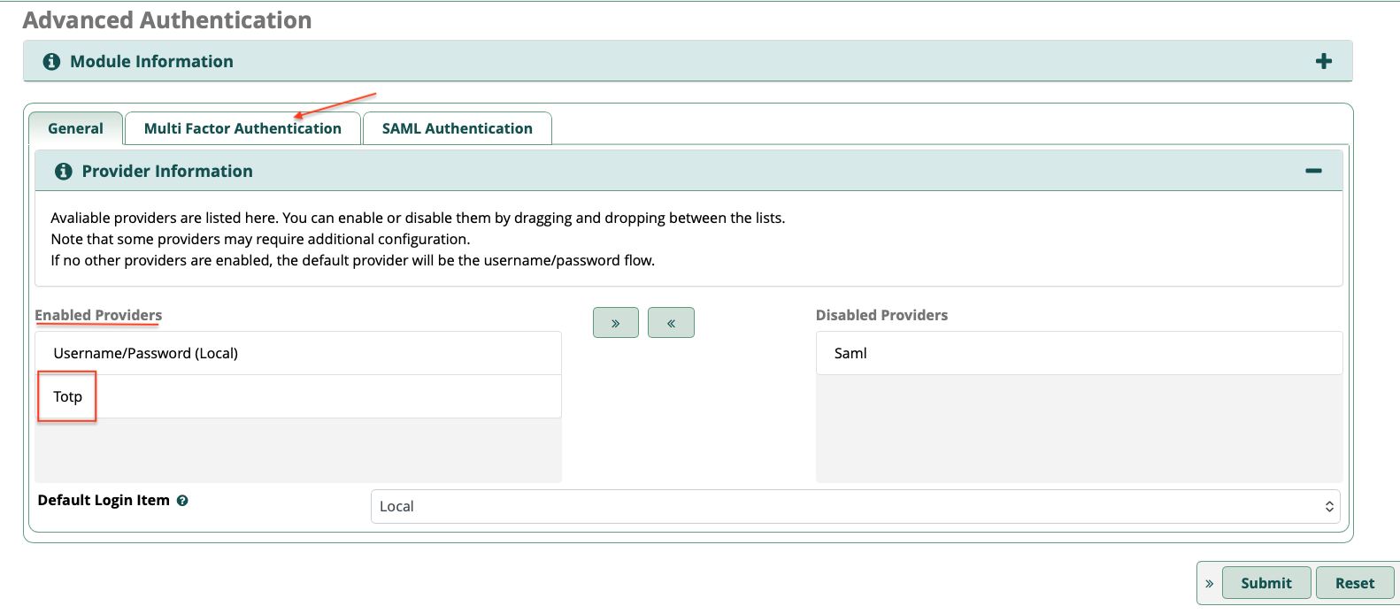 Note - if no other methods are enabled Local will be the default and will not allow you to move it to a disabled provider. Additionally, SAML will only appear if you have added the SAML module extension, otherwise you will only see Local and Totp as available providers.