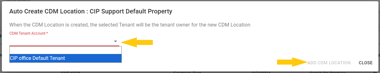 - A popup will show up in the center of the screen, here just select your corresponding CDM Tenant Account from the dropdown menu there and then click on the "ADD CDM LOCATION" button on the lower right corner: