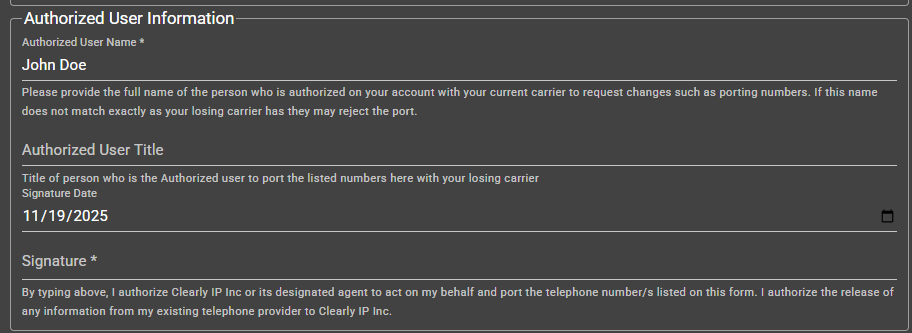 Any auto-filled information must be edited to match the losing carrier’s records exactly — even minor differences can cause rejections. If corrections are needed after the port is submitted, notify us in the porting ticket and our team will update the LOA.