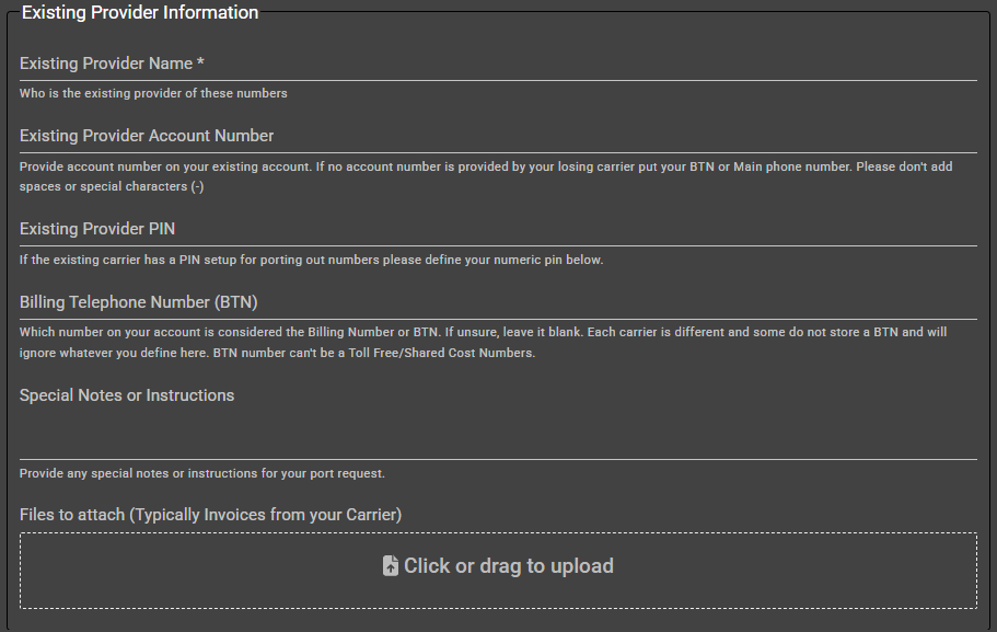 Choose your requested port-in date and time. We will submit the closest available date and time that the losing carrier supports. If the date that ends up being requested is not what you want, just reach out in the porting ticket tied to the port order and let us know. We will be able to make those changes as needed and be able to advise what will and will not work for the port in dates and times. If you need a specific date for port in, try to submit the port around two weeks before the date you need to ensure enough time for any rejections to be settled and for the port to be approved